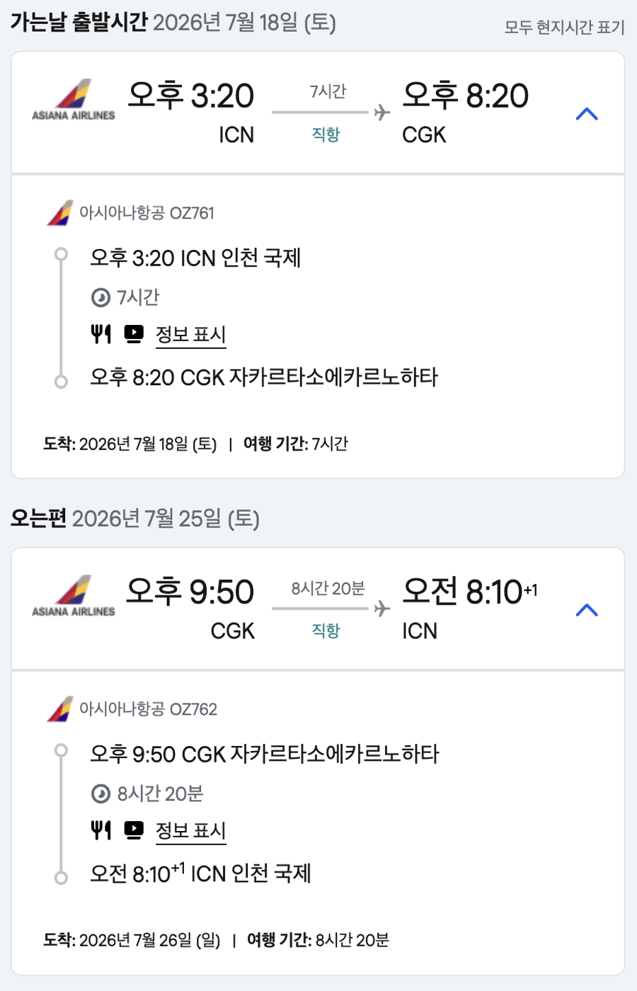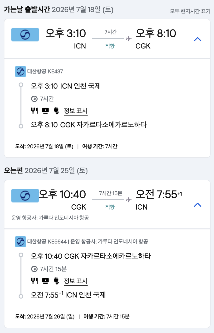 - 7/18(토): 인천 출발 → 자카르타 도착자카르타 공항 내 호텔 1박 (개별 예약)