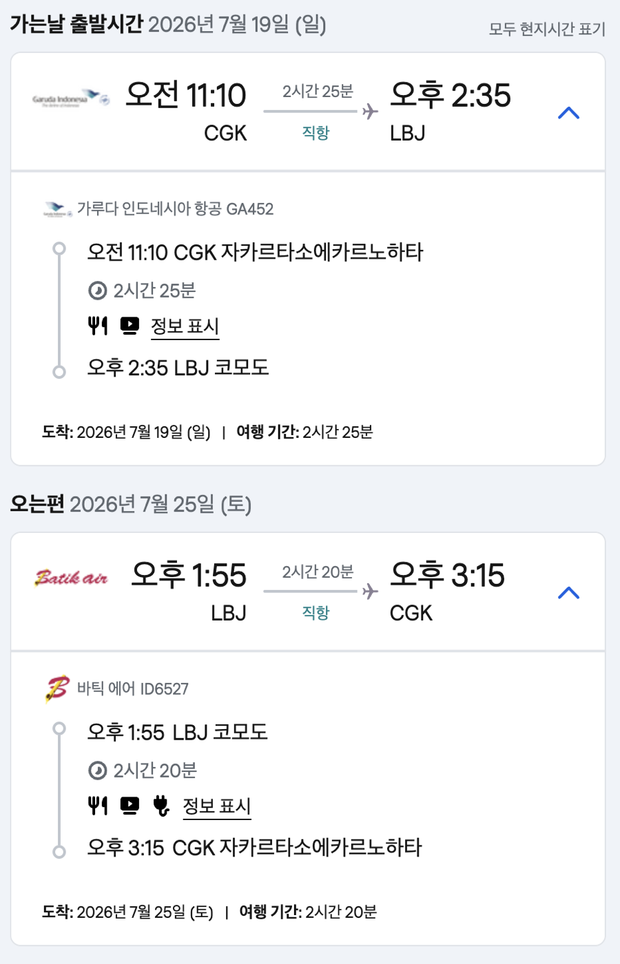 - 연결 발권: 인천-자카르타-코모도 수하물 자동 연결로 환승이 편리합니다.