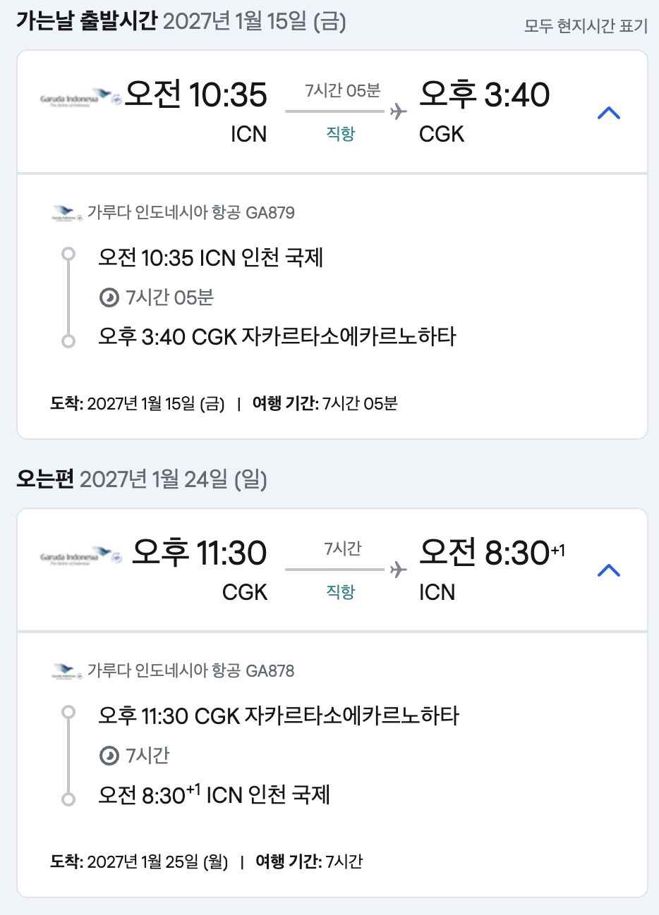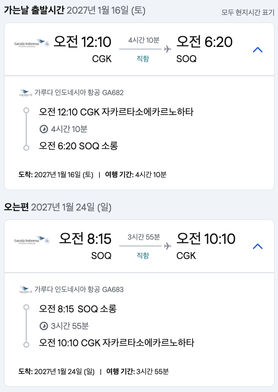 • 1/15(금): 인천 출발 → 자카르타 도착자카르타 공항 대기 후 익일 새벽 국내선 이동 (자카르타→소롱)